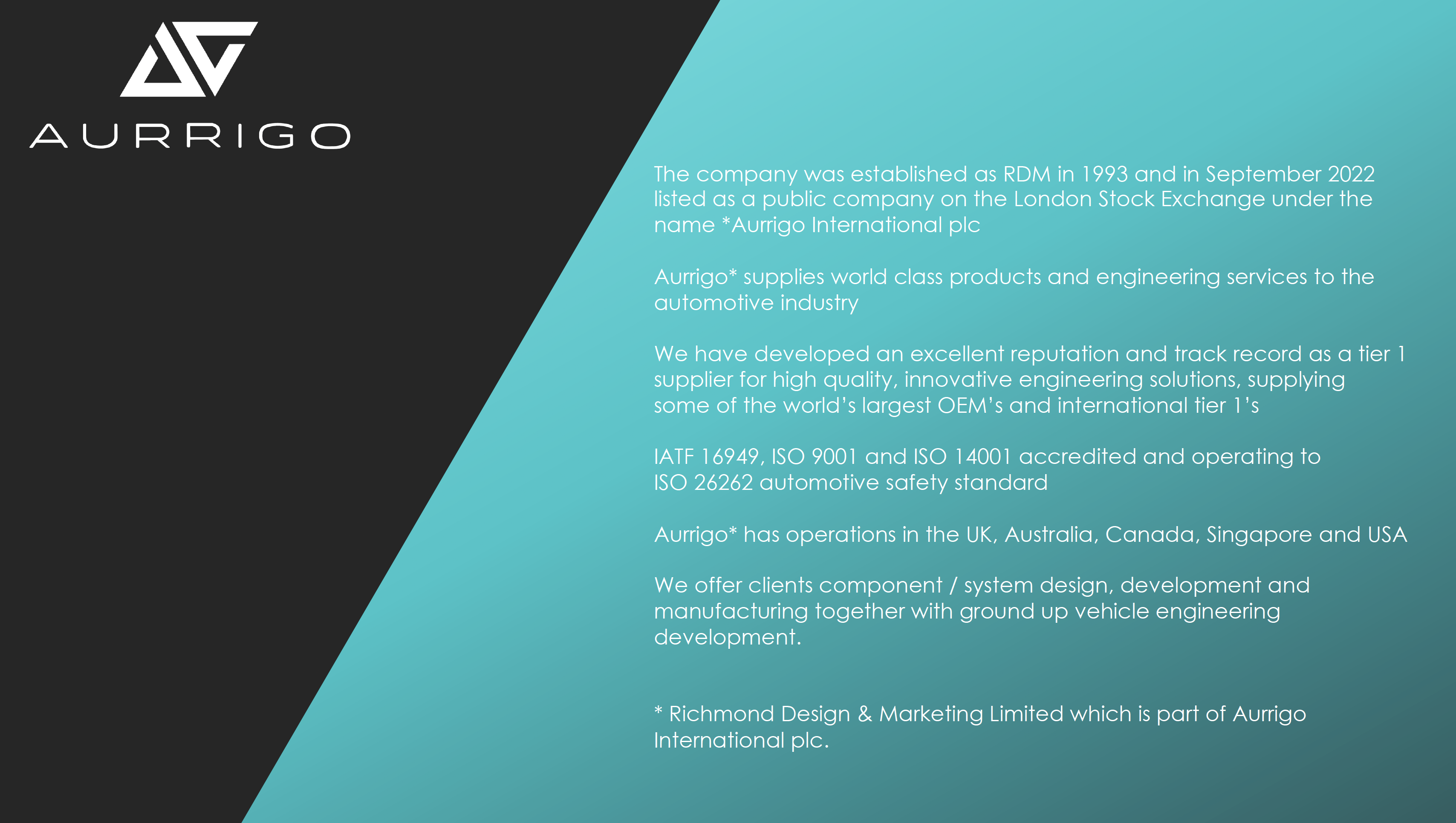 NEWS HOME INVESTORS JOIN THE TEAM email AURRIGOUNIT 33 BILTON INDUSTRIAL ESTATE HUMBER AVENUE, COVENTRY, CV3 1JL. UK 0044 (0)24 7663 5818 PRIVACY POLICY ANTI-SLAVERY AND HUMAN TRAFFICKING POLICY WHISTLEBLOWER POLICY MEDIA TAKE OFF PODCAST SUBSCRIBE AUTOMOTIVE AVIATION TEAM CONTACT